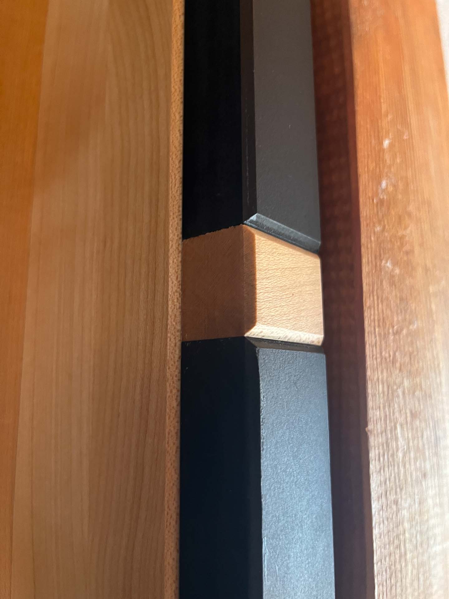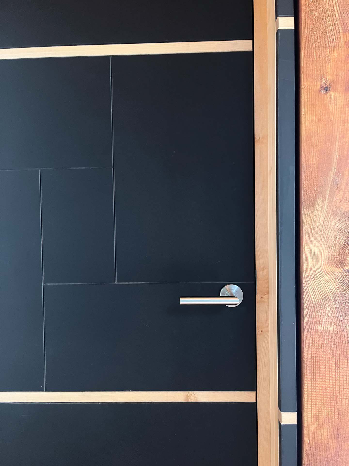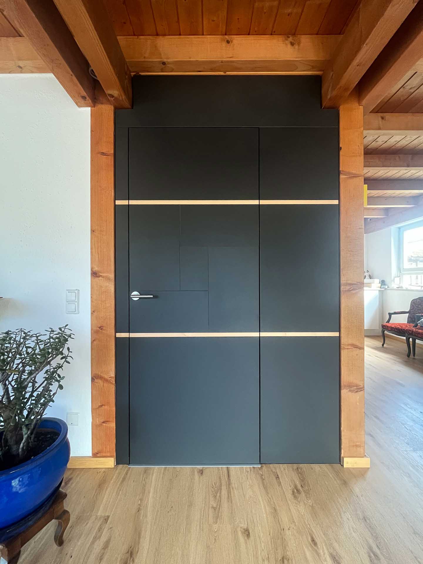 PRAXIS-TÜR NACH MAß Maßgefertigte Praxistür im Sondermaß mit schwarzer Linoleumoberfläche und Ahornprofilen. Anfrage senden