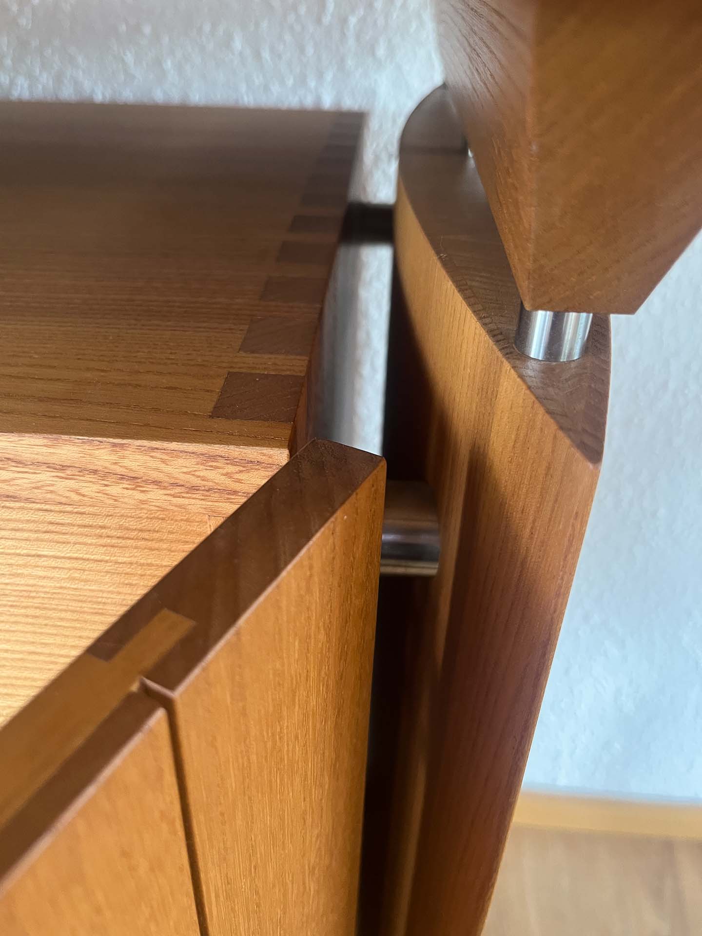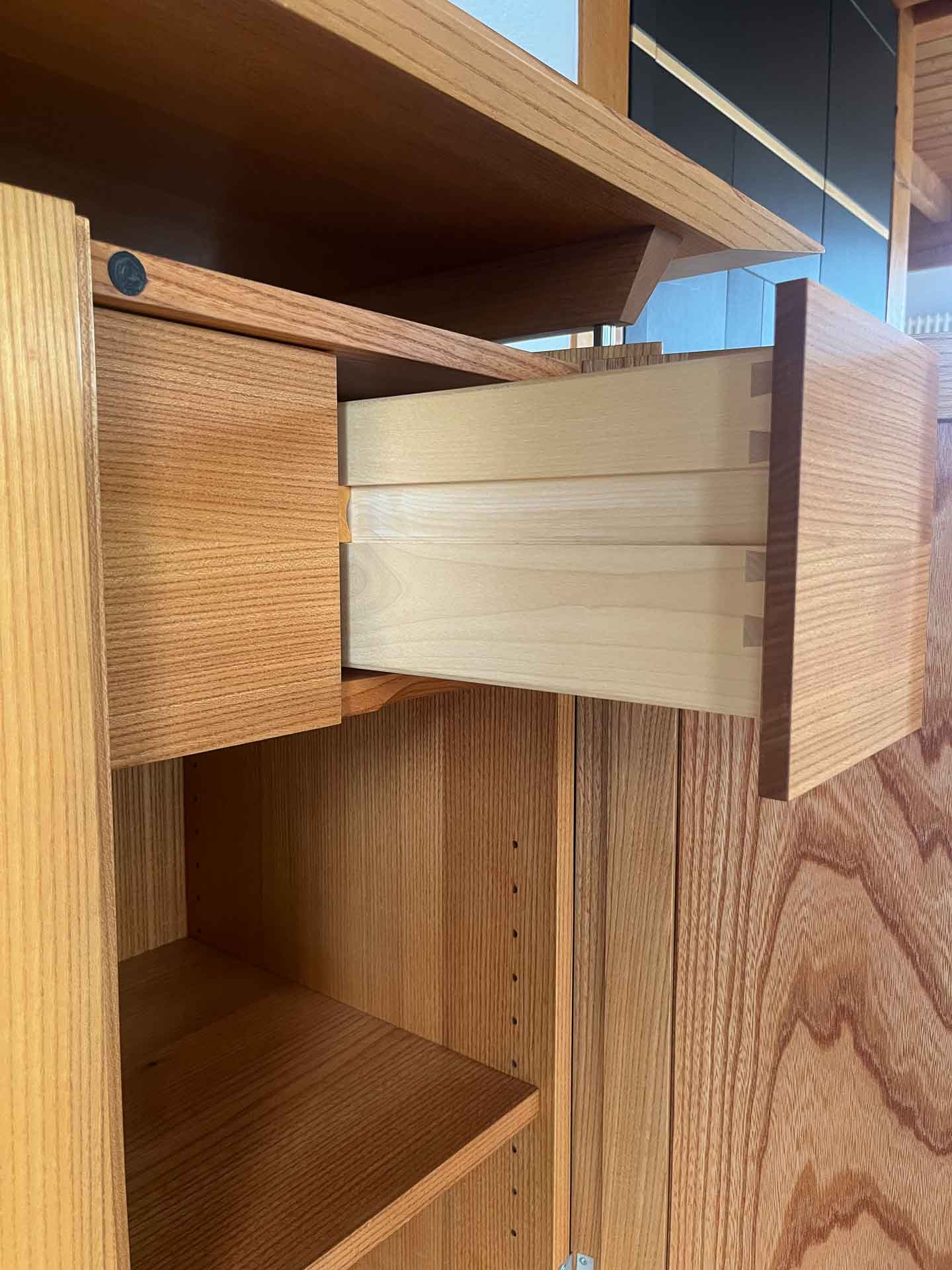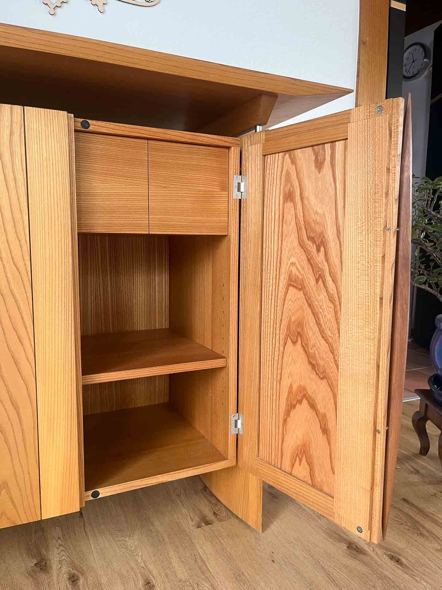SIDEBOARD S1: ein kompaktes, maßgefertigtes Sideboard aus Rüster. Für mehr Ordnung und Still im Raum. Anfrage senden