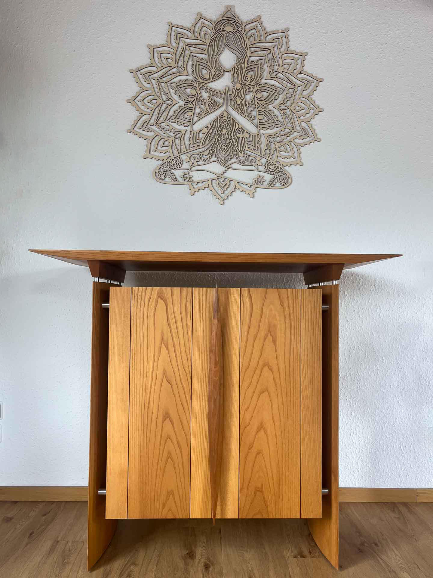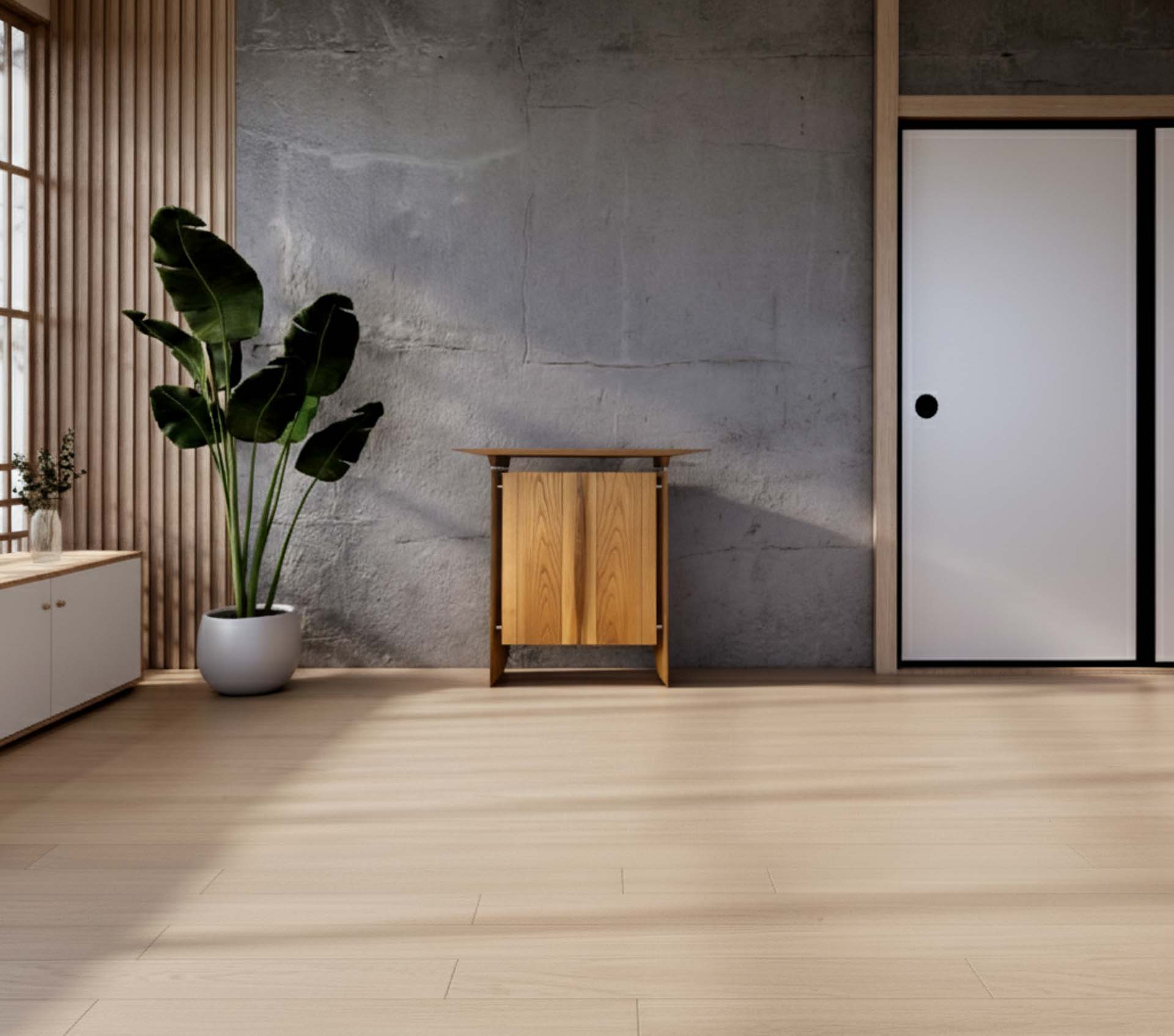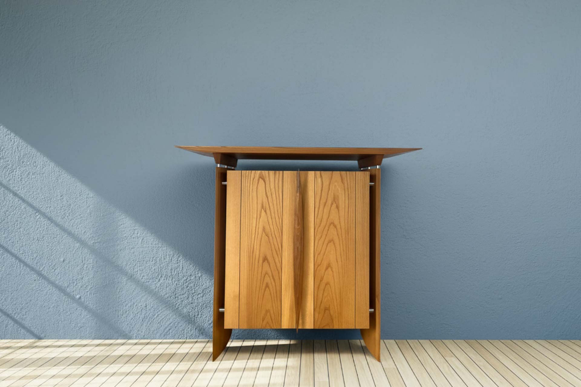 SIDEBOARD S1: ein kompaktes, maßgefertigtes Sideboard aus Rüster. Für mehr Ordnung und Still im Raum. Anfrage senden